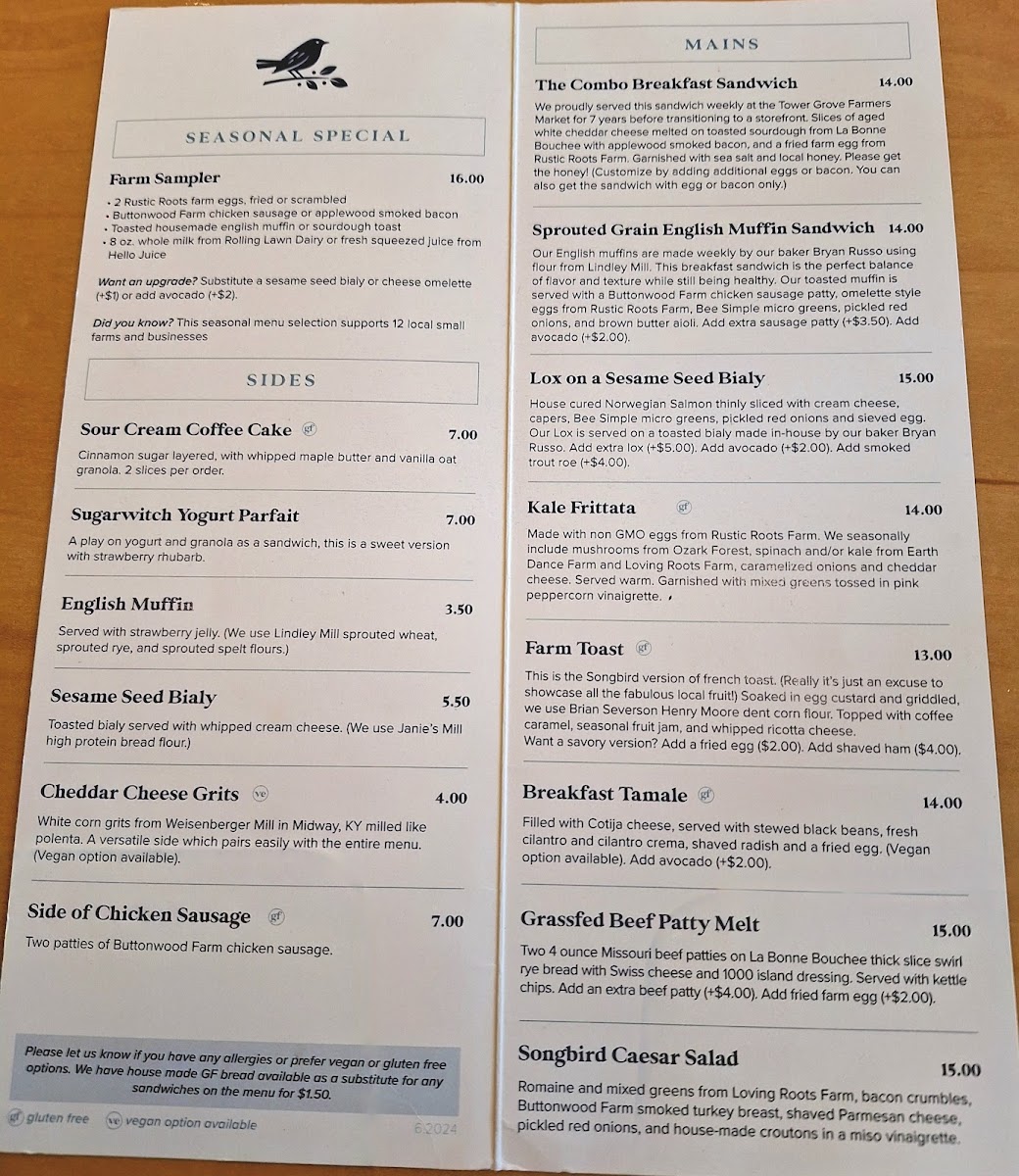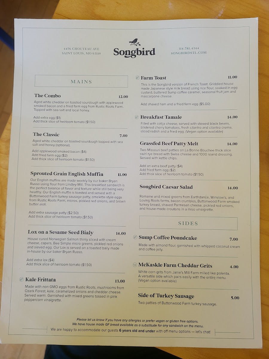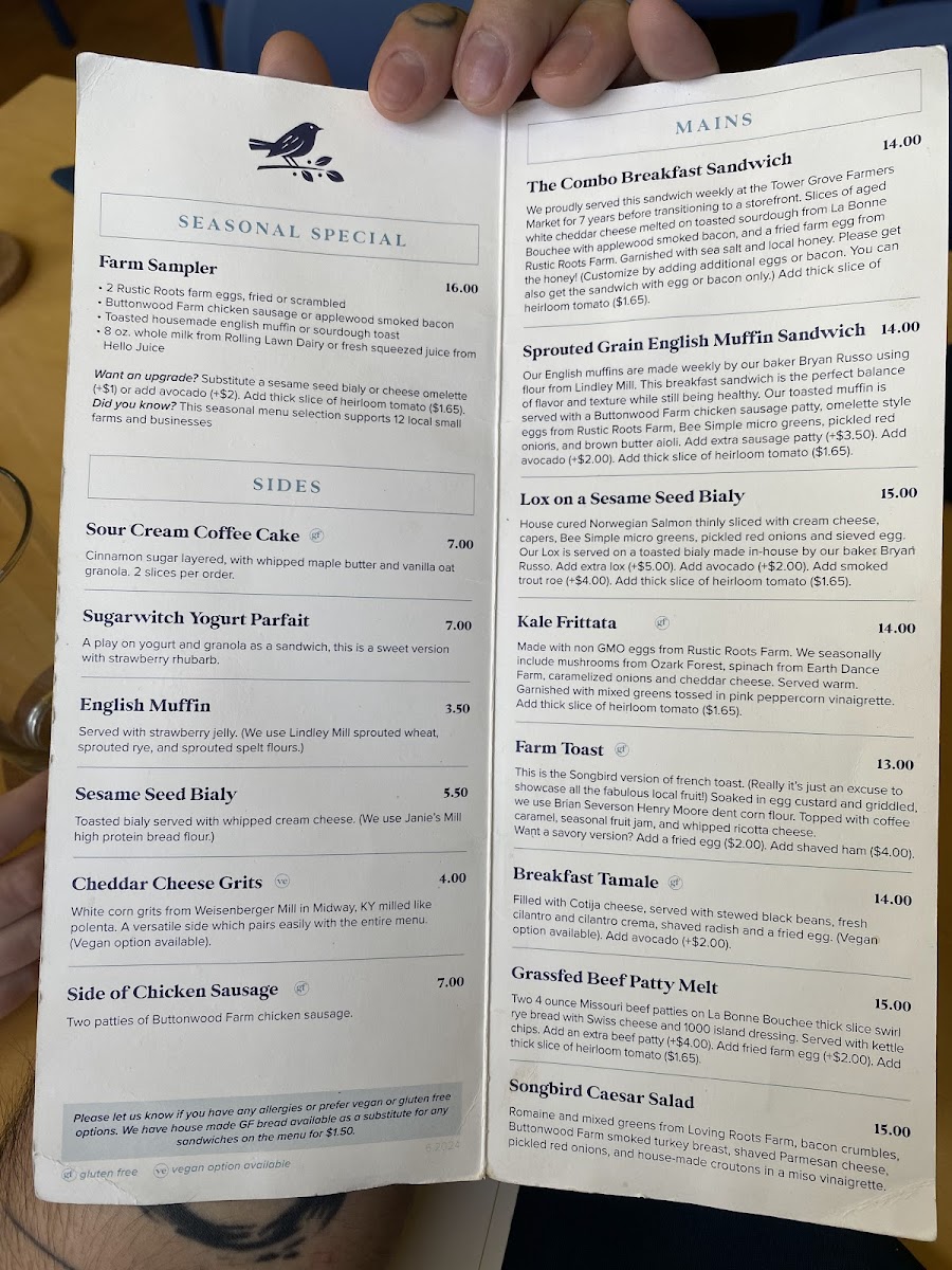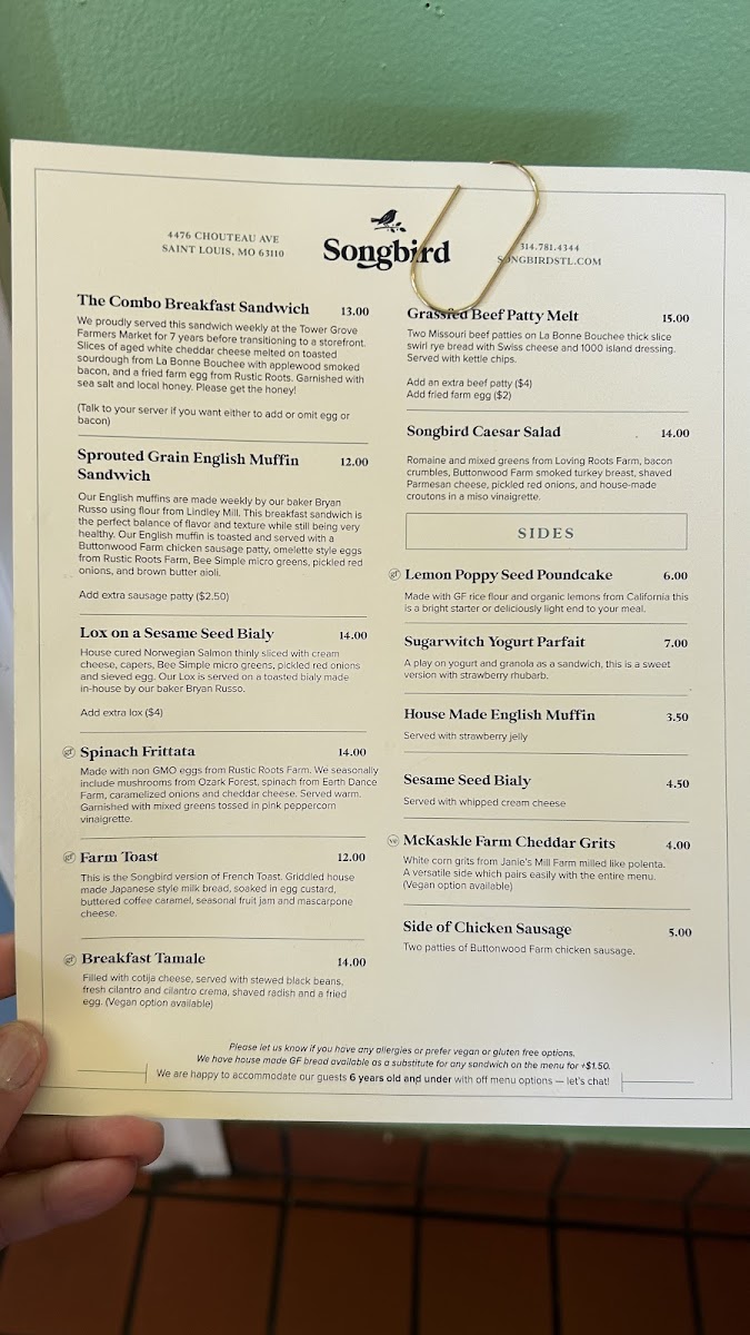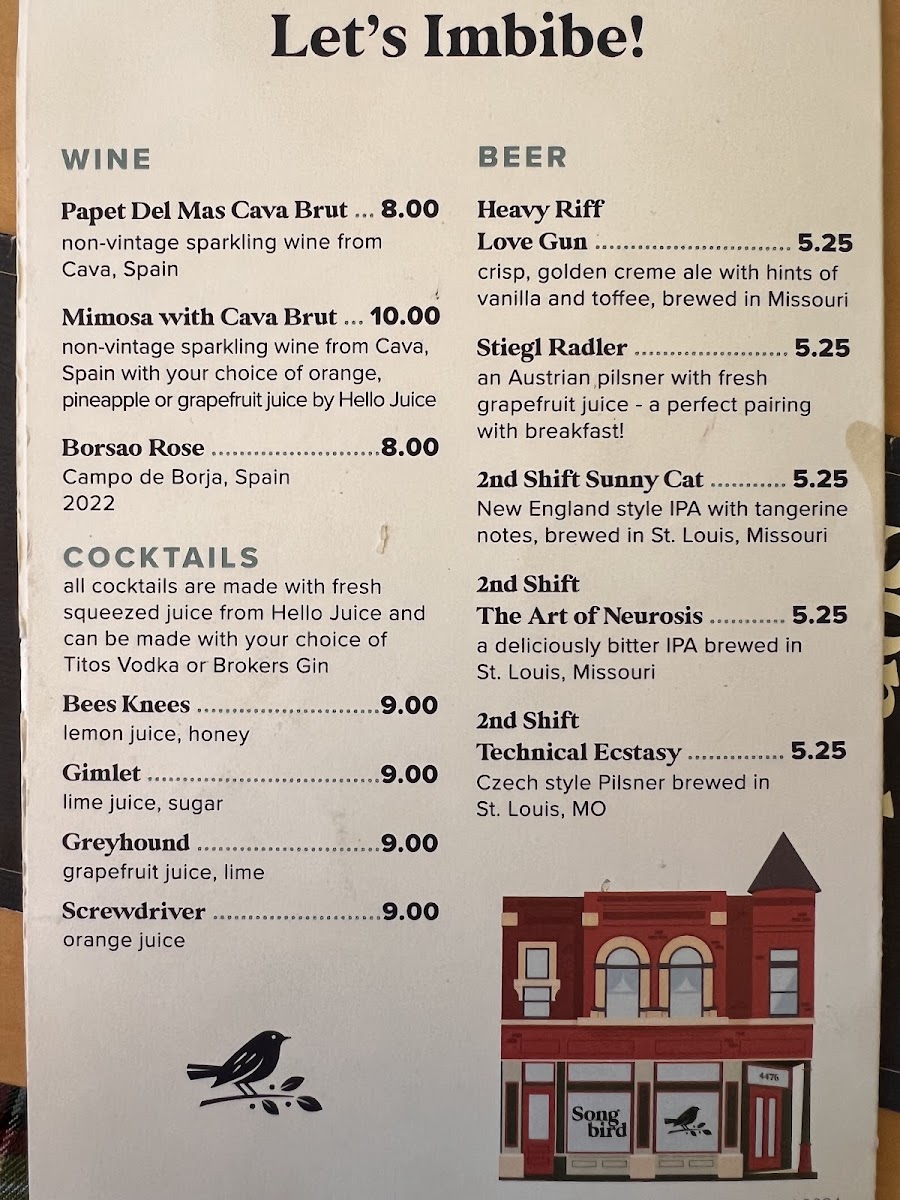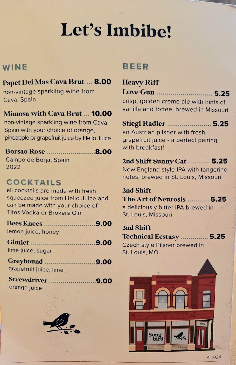 Welcome to Songbird, a charming restaurant tucked away at 4476 Chouteau Ave in St. Louis, MO. Known for its cozy atmosphere and friendly service, Songbird is a haven for breakfast lovers and coffee aficionados alike.